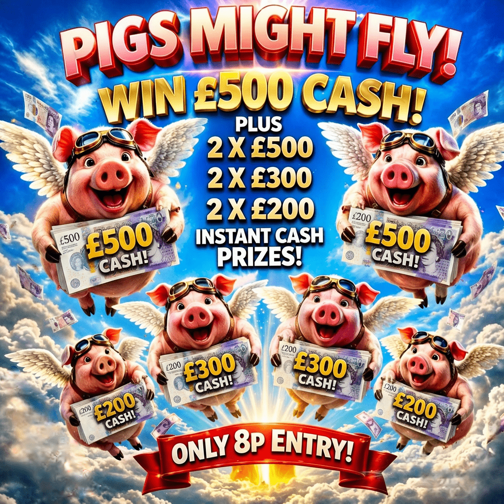 Prize PIGS MIGHT FLY, £500 END PRIZE PLUS 6 INSTANT CASH PIGS ONLY 8P